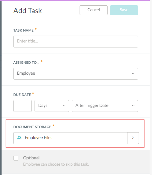 Start the process by creating a checklist of your choosing and adding a new Document Request Task following the usual steps, explained here. Once you chose "Document Request Task", you will see an option called Document Storage as seen below.